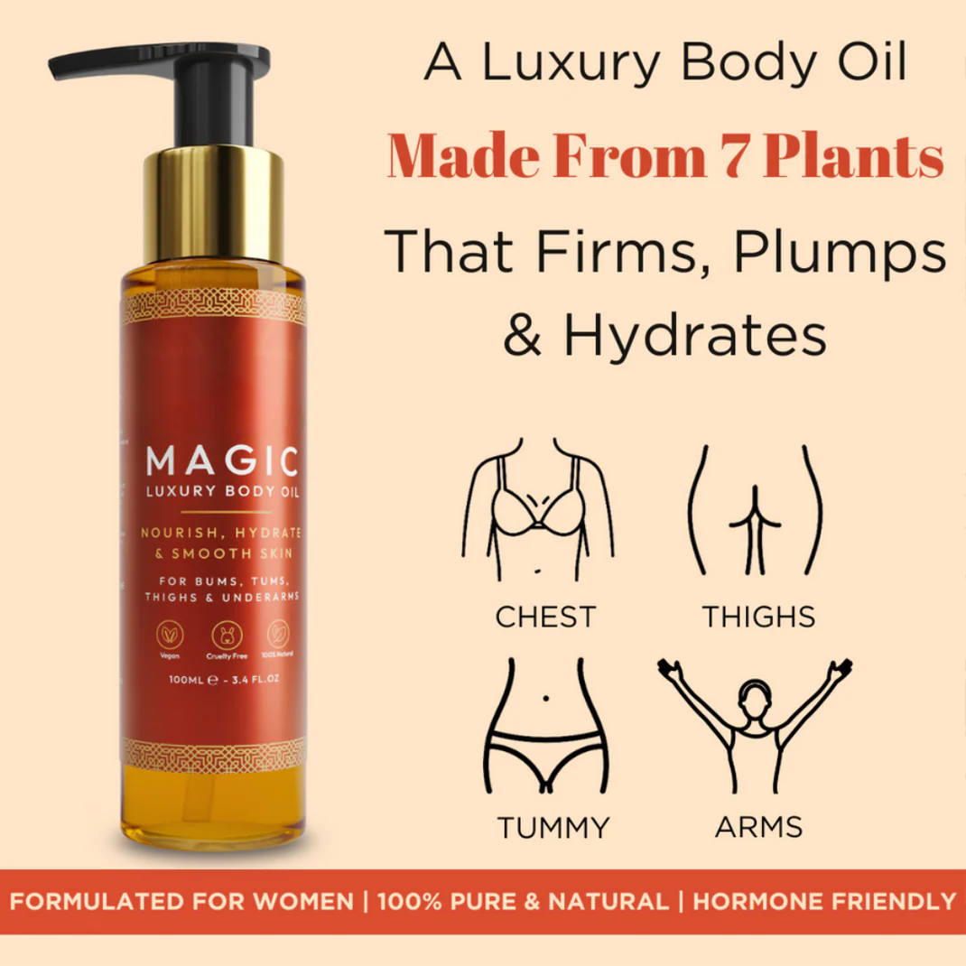 Reveal the smooth, toned, and radiant skin you’ve always dreamed of with our Luxury Magic Body Oil — your ultimate skin-loving ritual. Infused with powerful botanicals like Patchouli, Rosehip, and Geranium, this silky elixir deeply nourishes, firms, and revitalizes.